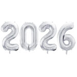 Bukiet balonowy SYLWESTROWY – stworzony z czterech foliowych cyfr 2026 (86 cm wysokości) w kolorze srebrnym to idealny zestaw na Sylwestrową noc. Zestaw balonów napełnionych helem świetnie zastąpi tradycyjny prezent w postaci alkoholu, kwiatów czy czekoladek.