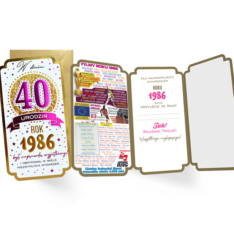 Kartka – 40 urodziny, rocznik 1986, kartka urodzinowa pełna wspomnień z 1986 roku. W środku znajdziesz najważniejsze wydarzenia tego roku, kultowe filmy, piosenki, które podbiły listy przebojów oraz sławne osoby, które przyszły na świat w tym wyjątkowym czasie. To idealny sposób na uczczenie tych okrągłych urodzin i przypomnienie o minionych latach w stylowy, humorystyczny sposób.