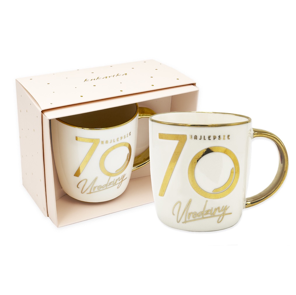 Ceramiczny kubek z jubileuszowej kolekcji to elegancki i pełen blasku prezent, stworzony z myślą o wyjątkowej okazji, jaką są 70. urodziny. Naczynie wykonane jest z wysokiej jakości białej ceramiki, którą zdobią lśniące, złote detale – duża cyfra „70” oraz napisy „Najlepsze Urodziny”. Wyjątkowego szyku dodaje w całości pozłacane ucho oraz delikatny złoty rant biegnący wokół krawędzi kubka. Produkt jest zapakowany w estetyczne, jasnoróżowe pudełko w delikatne kropki, dzięki czemu stanowi gotowy do wręczenia, luksusowy upominek dla bliskiej osoby.