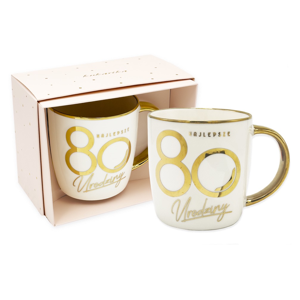 Ceramiczny kubek z jubileuszowej kolekcji to elegancki i pełen blasku prezent, stworzony z myślą o wyjątkowej okazji, jaką są 80. urodziny. Naczynie wykonane jest z wysokiej jakości białej ceramiki, którą zdobią lśniące, złote detale – duża cyfra „80” oraz napisy „Najlepsze Urodziny”. Wyjątkowego szyku dodaje w całości pozłacane ucho oraz delikatny złoty rant biegnący wokół krawędzi kubka. Produkt jest zapakowany w estetyczne, jasnoróżowe pudełko w delikatne kropki, dzięki czemu stanowi gotowy do wręczenia, luksusowy upominek dla bliskiej osoby.