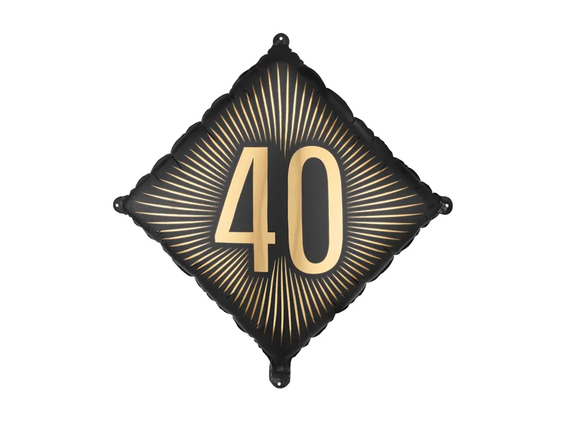 Balon foliowy – 40, Kwadrat 46×46 cm. Balon foliowy w kolorze czarnym ze złotym napisem ”40”. Wymiary przed napompowaniem ok. 54 x 54 cm (20 x 20”), wymiary po napompowaniu ok. 46 x 46 cm (18 x 18”). Do napompowania powietrzem i helem. Zestaw zawiera słomkę.