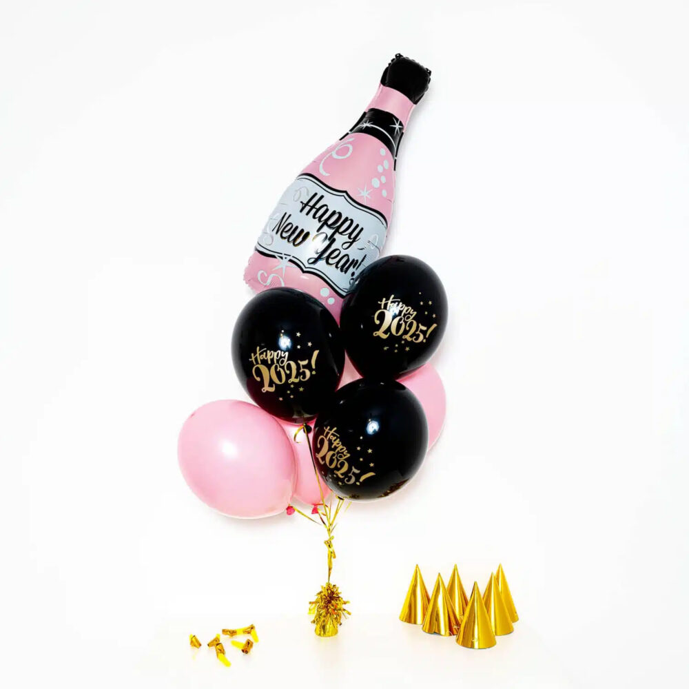Bukiet balonowy SYLWESTROWY – stworzony z różowej, foliowej BUTELKI szampana z napisem “Happy New Year”, trzech gumowych, różowych balonów oraz trzech czarnych balonów ze złotym napisem “Happy 2025!” to idealny zestaw na Sylwestrową noc. Zestaw balonów napełnionych helem świetnie zastąpi tradycyjny prezent w postaci alkoholu, kwiatów czy czekoladek.