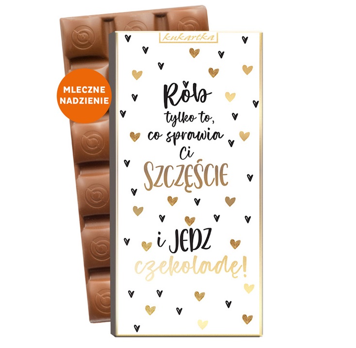 Czekolada z motywującym napisem “Jedz czekoladę” to słodki upominek o pozytywnym przesłaniu. Produkt ten zawiera tabliczkę czekolady w wersji mlecznej, zapakowanej w kartonik z wyraźnym, zachęcającym tekstem. Jest to doskonały, mały prezent, który ma na celu poprawę nastroju i dodanie odrobiny słodyczy do codzienności. Opakowanie czyni ją idealną jako motywacyjny gadżet lub drobny pocieszacz.