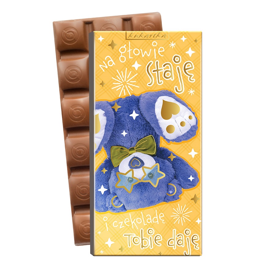 Urocza czekolada prezentowa z grafiką niebieskiego misia i napisem „Na głowie staję” to doskonały sposób, by wyrazić uczucia w słodki i oryginalny sposób. Zapakowana w ozdobny kartonik, kryje w sobie pyszną mleczną czekoladę o wadze 100 g. Idealna jako drobny upominek na urodziny, rocznicę lub po prostu, by poprawić komuś humor.