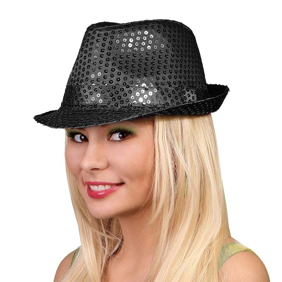 Czarny kapelusz w cekiny, który dodaje blasku i stylu każdej kreacji, idealny na imprezy, karnawał i przebrania tematyczne.