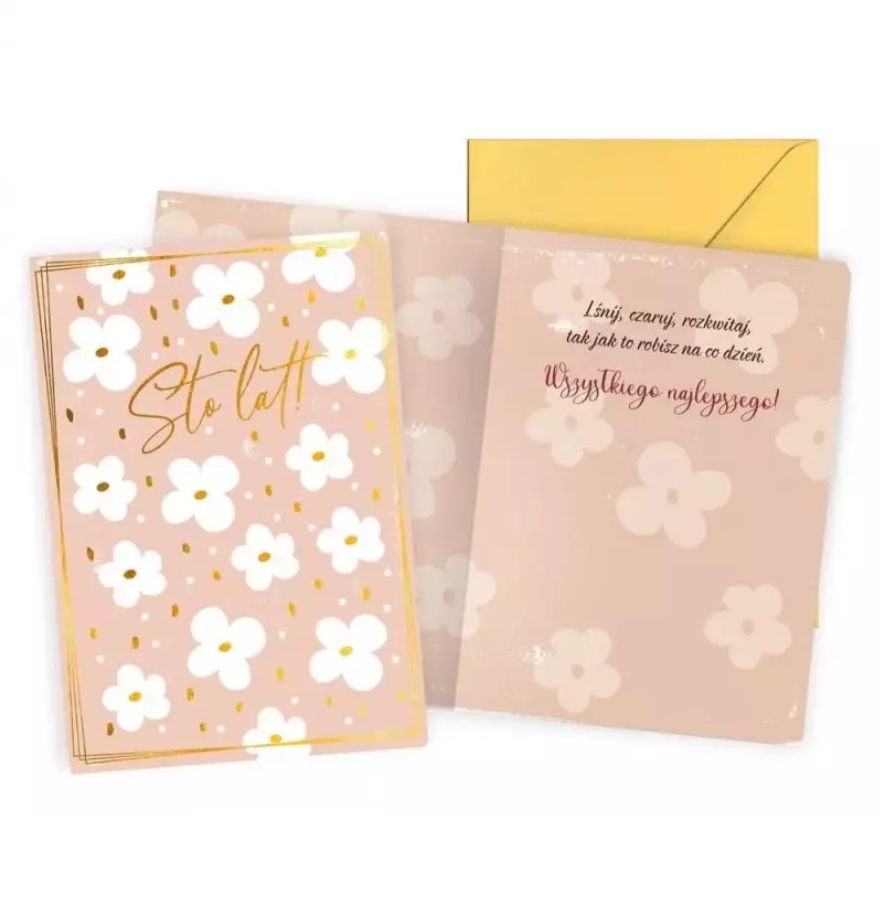 Elegancka kartka urodzinowa to klasyczny sposób na przekazanie ciepłych słów bliskiej osobie. Projekt utrzymany jest w delikatnej, pastelowej kolorystyce brudnego różu, ozdobionej uroczym motywem białych kwiatuszków ze złotymi środkami. Front kartki zdobi efektowny, pozłacany napis „Sto lat!” ujęty w subtelną, złotą ramkę, co nadaje całości luksusowego charakteru. Wewnątrz karnetu znajdują się inspirujące życzenia: „Lśnij, czaruj, rozkwitaj, tak jak to robisz na co dzień. Wszystkiego najlepszego!”. Do zestawu dołączona jest dopasowana kolorystycznie żółta koperta, dzięki której upominek jest gotowy do wręczenia lub wysłania pocztą. To idealny wybór dla osób ceniących subtelny design i elegancką formę wyrażania uczuć.