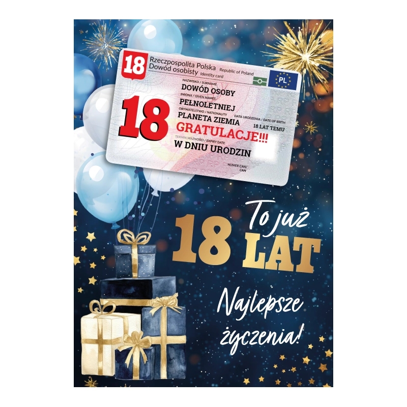 Kartka okolicznościowa – 18 lat – dowód, prezenty