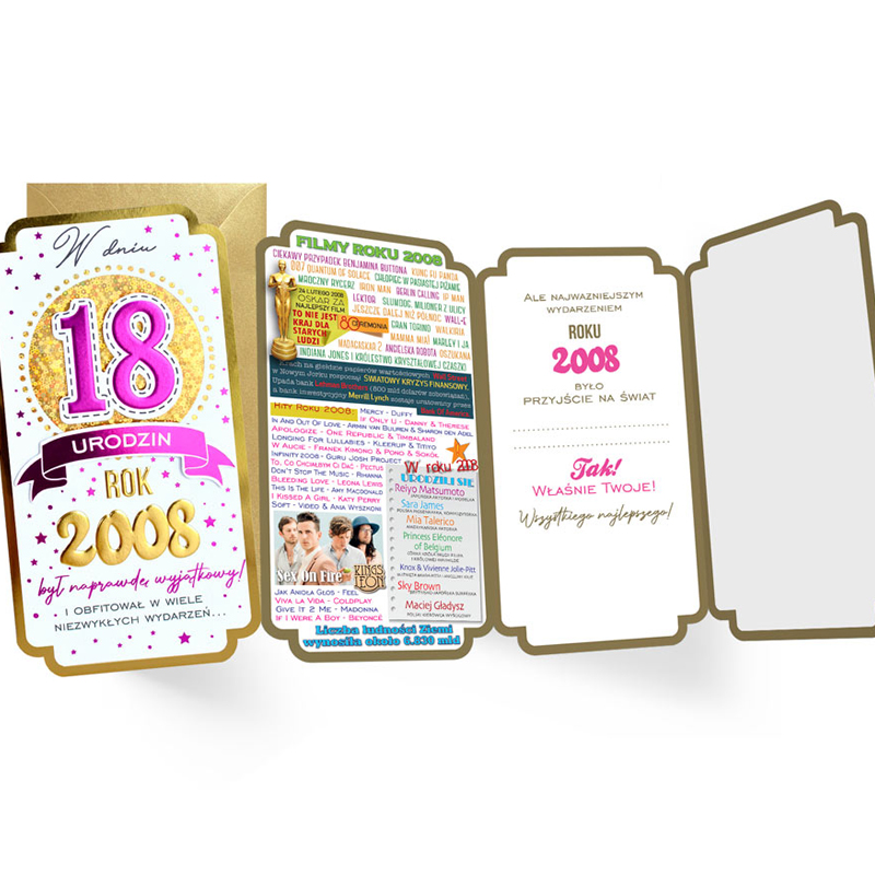 Kartka – 18 urodziny, rocznik 2008, kartka urodzinowa pełna wspomnień z 2008 roku. W środku znajdziesz najważniejsze wydarzenia tego roku, kultowe filmy, piosenki, które podbiły listy przebojów oraz sławne osoby, które przyszły na świat w tym wyjątkowym czasie. To idealny sposób na uczczenie tych okrągłych urodzin i przypomnienie o minionych latach w stylowy, humorystyczny sposób.