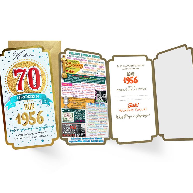 Kartka – 70 urodziny, rocznik 1956, kartka urodzinowa pełna wspomnień z 1956 roku. W środku znajdziesz najważniejsze wydarzenia tego roku, kultowe filmy, piosenki, które podbiły listy przebojów oraz sławne osoby, które przyszły na świat w tym wyjątkowym czasie. To idealny sposób na uczczenie tych okrągłych urodzin i przypomnienie o minionych latach w stylowy, humorystyczny sposób.