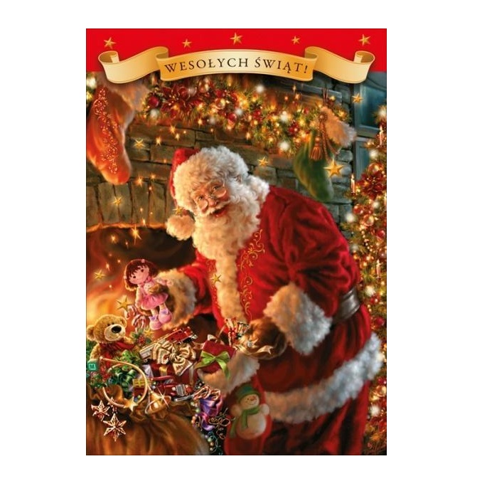 Kartka świąteczna „Wesołych Świąt” to klasyczna i pełna ciepła propozycja, idealna na bożonarodzeniowe życzenia. Przedstawia realistycznego Mikołaja w tradycyjnym stroju, który w blasku świątecznych światełek dyskretnie podkłada prezenty przy kominku. Nastrojowa i elegancka ilustracja wprowadza w magiczny klimat świąt, czyniąc tę kartkę wyjątkowym dodatkiem do świątecznego upominku dla bliskich.