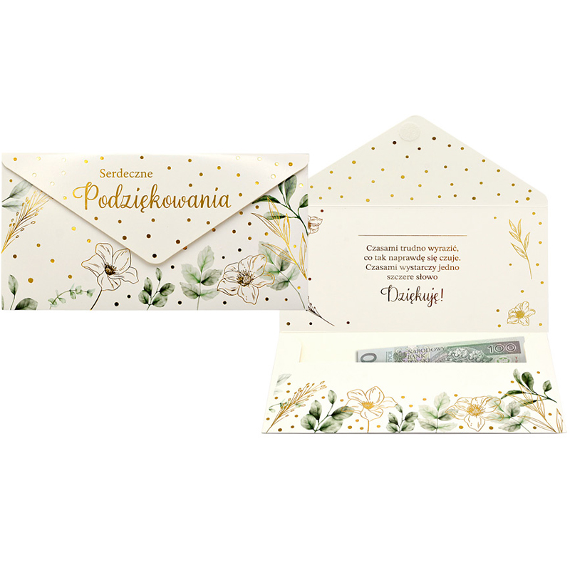Koperta podarunkowa jest eleganckim sposobem na podarowanie bliskiej osobie banknotu lub karty podarunkowej. Koperta jest kolorowa i uszlachetniona metalizowaną folią hot-stamp, jest solidnie wykonana i wyposażona w rzep, co umożliwia jej wielokrotne otwieranie i zamykanie. Koperta zawiera życzenia w środku.