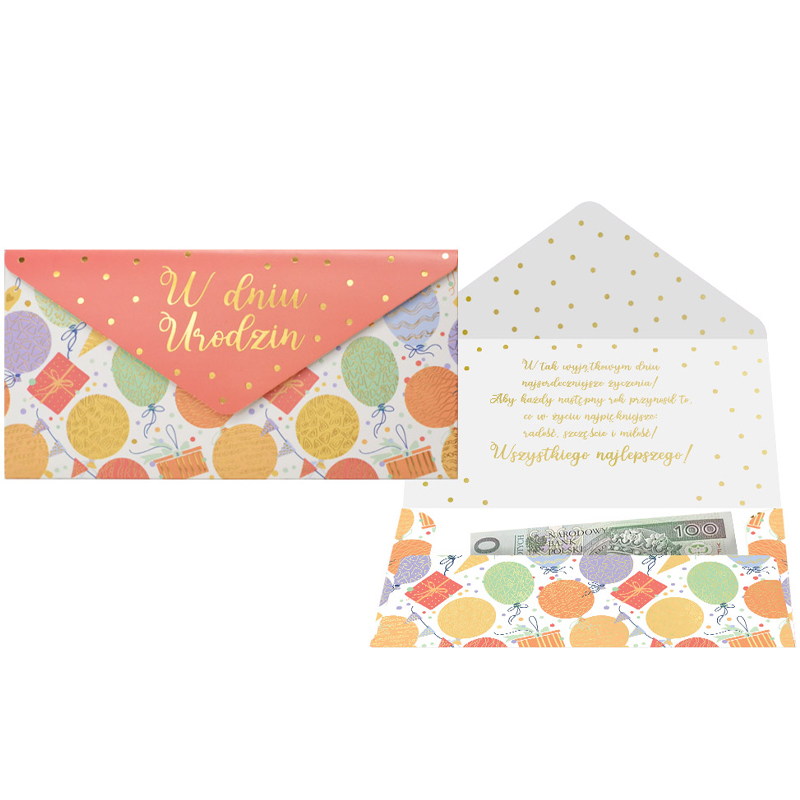 Koperta podarunkowa jest eleganckim sposobem na podarowanie bliskiej osobie banknotu lub karty podarunkowej. Koperta jest kolorowa i uszlachetniona metalizowaną folią hot-stamp, jest solidnie wykonana i wyposażona w rzep, co umożliwia jej wielokrotne otwieranie i zamykanie. Koperta zawiera życzenia w środku.