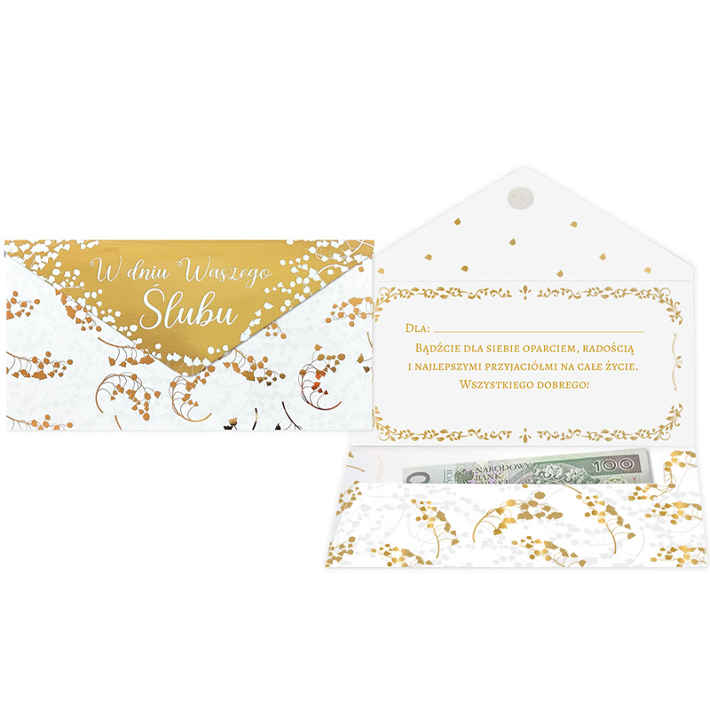 Koperta podarunkowa jest eleganckim sposobem na podarowanie bliskiej osobie banknotu lub karty podarunkowej. Koperta jest kolorowa i uszlachetniona metalizowaną folią hot-stamp, jest solidnie wykonana i wyposażona w rzep, co umożliwia jej wielokrotne otwieranie i zamykanie. Koperta zawiera życzenia w środku.