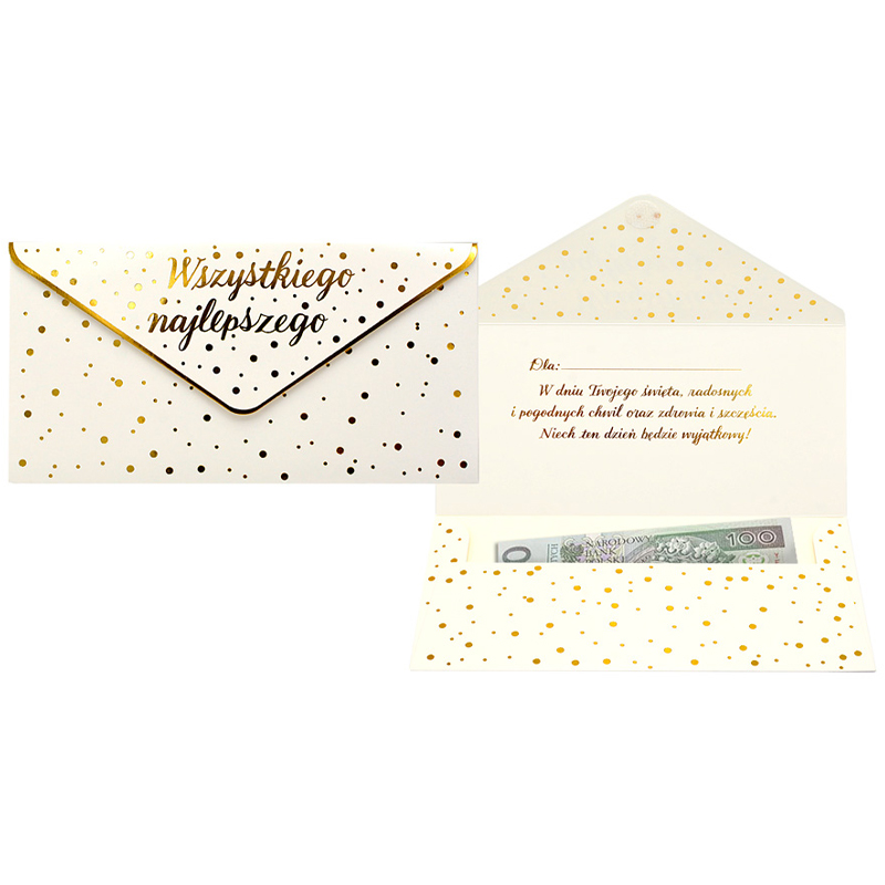 Koperta podarunkowa jest eleganckim sposobem na podarowanie bliskiej osobie banknotu lub karty podarunkowej. Koperta jest kolorowa i uszlachetniona metalizowaną folią hot-stamp, jest solidnie wykonana i wyposażona w rzep, co umożliwia jej wielokrotne otwieranie i zamykanie. Koperta zawiera życzenia w środku.