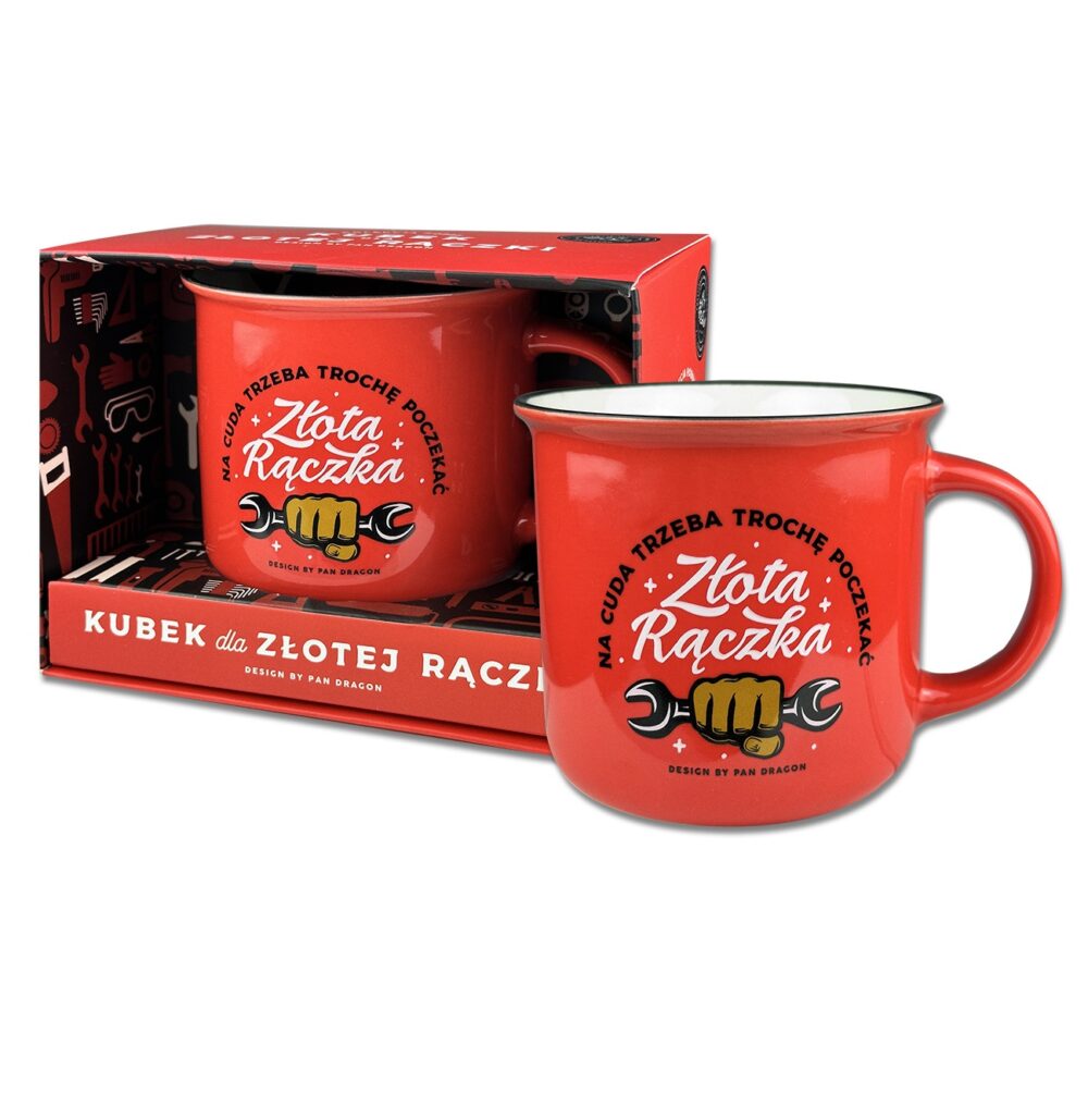 Kubek ceramiczny z kolekcji Hobby, ozdobiony hasłem “Złota rączka, na cuda trzeba trochę poczekać”, to idealny gadżet dla majsterkowiczów, budowlańców, techników lub każdego, kto ma talent do napraw i prac manualnych. Kubek wykonany jest z trwałej ceramiki. Ma humorystyczny nadruk, który łączy dumę z umiejętnościami z żartobliwą nutą o czasie wykonania. Jest to praktyczny i wesoły upominek. Kubek doskonale sprawdzi się w warsztacie lub podczas zasłużonej przerwy na kawę.