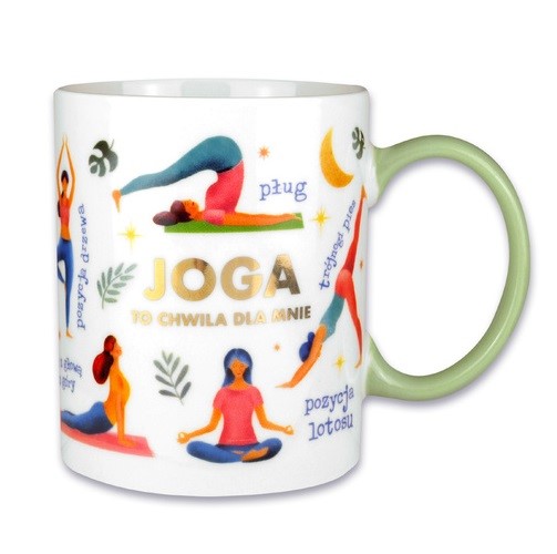 Ceramiczny kubek dla pasjonatów jogi z hasłem “Joga to chwila dla mnie” to idealny sposób na celebrowanie momentów spokoju i relaksu. Białą ceramikę zdobią kolorowe ilustracje przedstawiające popularne asany, takie jak pozycja lotosu, drzewa czy psa z głową w dół, wraz z ich nazwami. Centralny napis wykonany w błyszczącym, złotym kolorze nadaje naczyniu elegancji, a delikatne, zielone ucho doskonale dopełnia harmonijną grafikę. To stylowy i inspirujący gadżet, który sprawi, że każda filiżanka herbaty po treningu stanie się wyjątkowym rytuałem uważności.