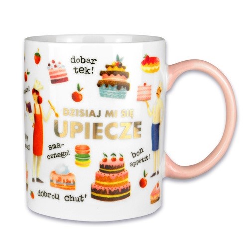 Ceramiczny kubek dla pasjonatów pieczenia z hasłem „Dzisiaj mi się upiecze” to uroczy dodatek, który osłodzi każdą chwilę z kawą lub herbatą. Białą ceramikę zdobią apetyczne ilustracje wielopiętrowych tortów, babeczek i makaroników oraz postaci cukierników przy pracy. Całość uzupełniają międzynarodowe życzenia smacznego, takie jak „bon appétit!” czy „dobrou chut’”. Główny napis w złotym kolorze nadaje naczyniu elegancji, a delikatne, różowe ucho idealnie podkreśla osłodzony charakter grafiki. To doskonały prezent dla domowych mistrzów wypieków i każdego, kto kocha celebrować małe przyjemności w pięknej oprawie.