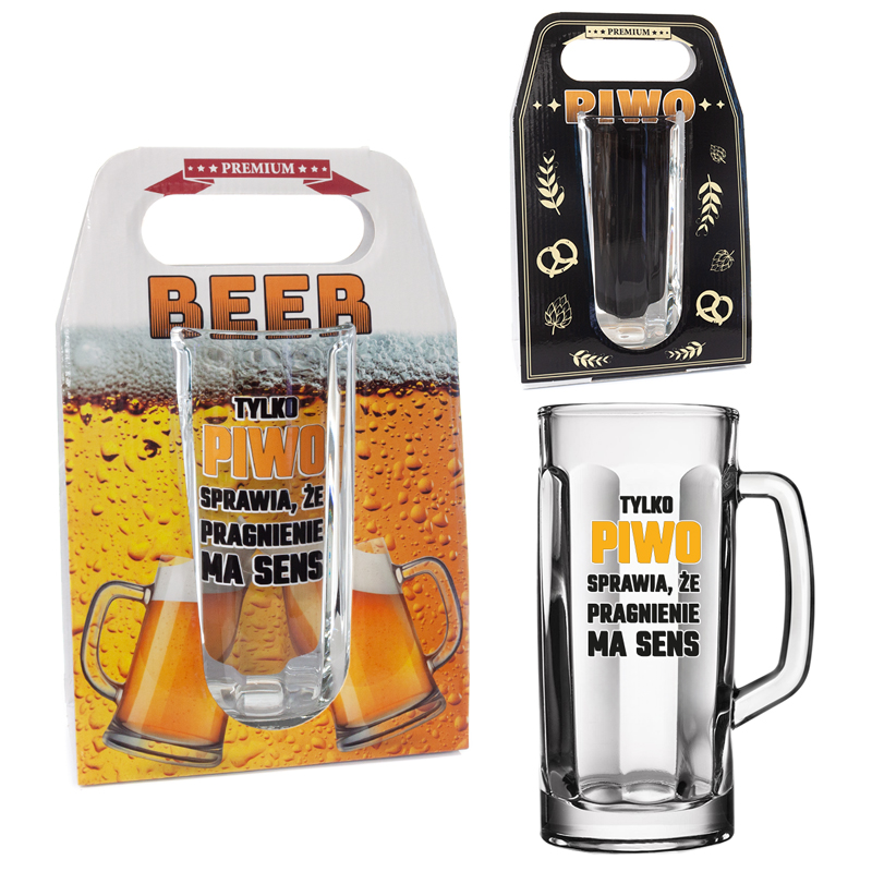 Kufel do piwa z napisem “Tylko Piwo sprawia że pragnienie ma sens” w ozdobnym opakowaniu .