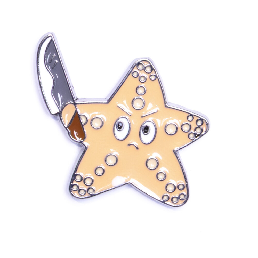 Pin Rozgwiazda z Nożem to zabawna i nieco mroczna przypinka przedstawiająca rozgwiazdę trzymającą nóż, łącząc uroczy wygląd z odrobiną zadziornego charakteru. Doskonale sprawdzi się na plecaku, torbie, kurtce czy czapce, dodając stylizacji nietypowego i humorystycznego akcentu. To idealny gadżet dla osób, które lubią kreatywne, wyraziste i zaskakujące dodatki.