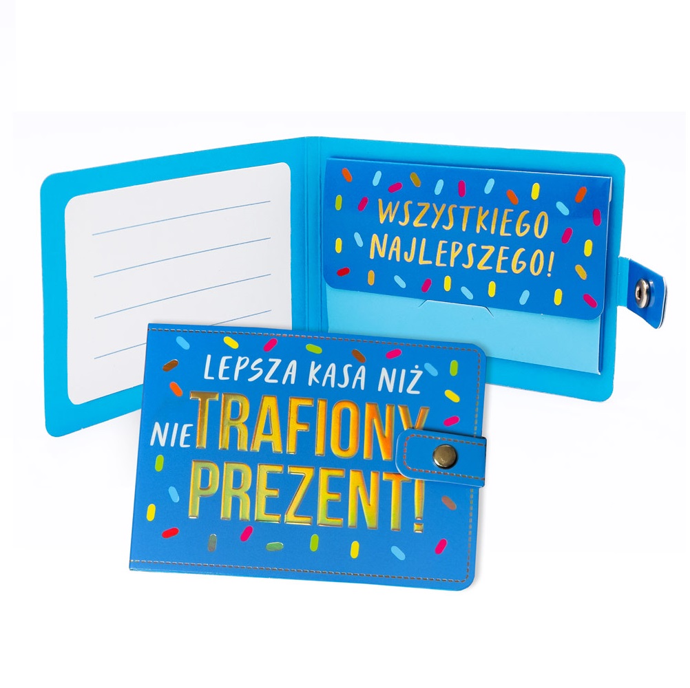 Portfelik prezentowy „Lepsza kasa niż nietrafiony prezent!” to zabawny i praktyczny sposób na wręczenie pieniędzy zamiast tradycyjnego upominku. W środku znajduje się miejsce na wpisanie życzeń oraz kieszonka na gotówkę lub voucher. Humorystyczny napis i oryginalny design sprawiają, że to idealny dodatek do prezentu na urodziny, imieniny czy inne okazje.