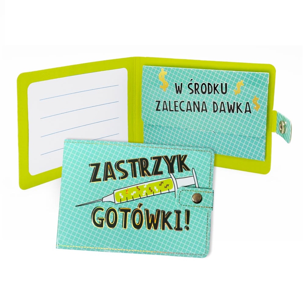 Portfelik prezentowy „Zastrzyk gotówki!” to humorystyczny sposób na wręczenie prezentu pieniężnego. W środku znajduje się miejsce na osobiste życzenia oraz kieszonka na banknoty lub drobny upominek. Idealny na każdą okazję, kiedy chcesz podarować coś praktycznego i z uśmiechem.