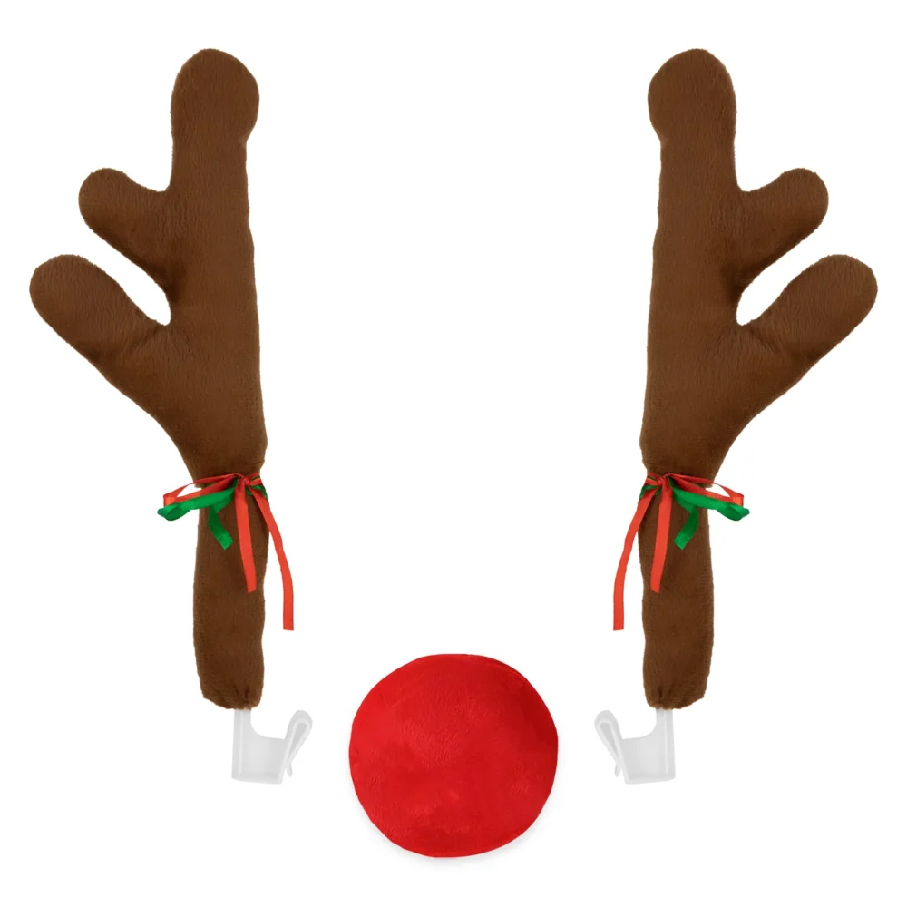 Zestaw dekoracyjny przekształcający Twój samochód w renifera. Komplet składa się z dwóch pluszowych rogów mocowanych do przednich szyb bocznych oraz dużego, czerwonego nosa do zamontowania na grillu pojazdu. Rogi są wzmacniane tak, aby utrzymać kształt podczas jazdy, a nos posiada elastyczne mocowanie. Jest to zabawny sposób na wprowadzenie świątecznej atmosfery na drogę.