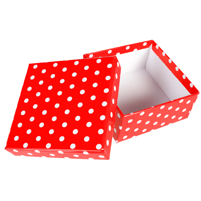 Pudełko prezentowe kwadratowe, czerwone w białe kropki.