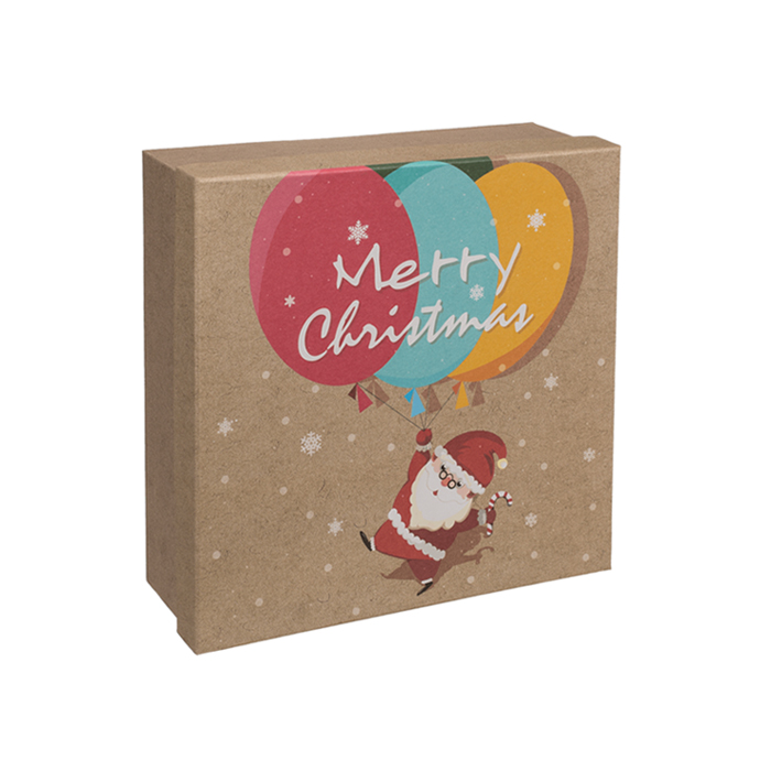 Pudełko prezentowe kwadratowe z nadrukiem Mikołaja lecącego na balonach.