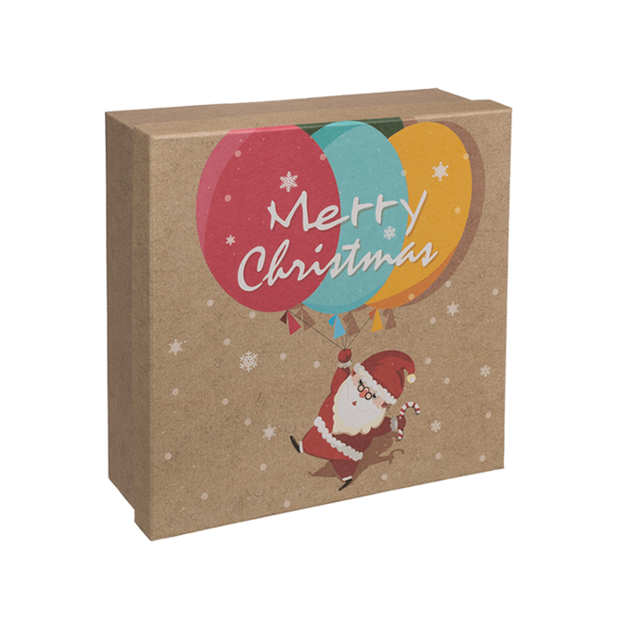 Pudełko prezentowe kwadratowe z nadrukiem Mikołaja lecącego na balonach.