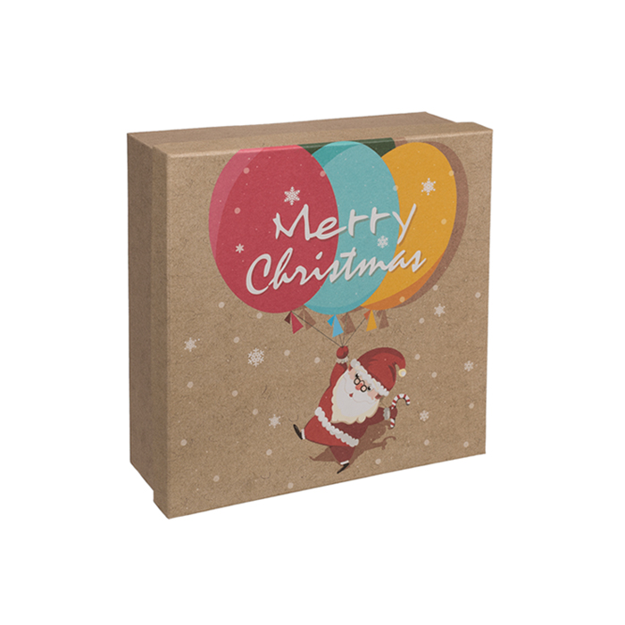 Pudełko prezentowe kwadratowe z nadrukiem Mikołaja lecącego na balonach.