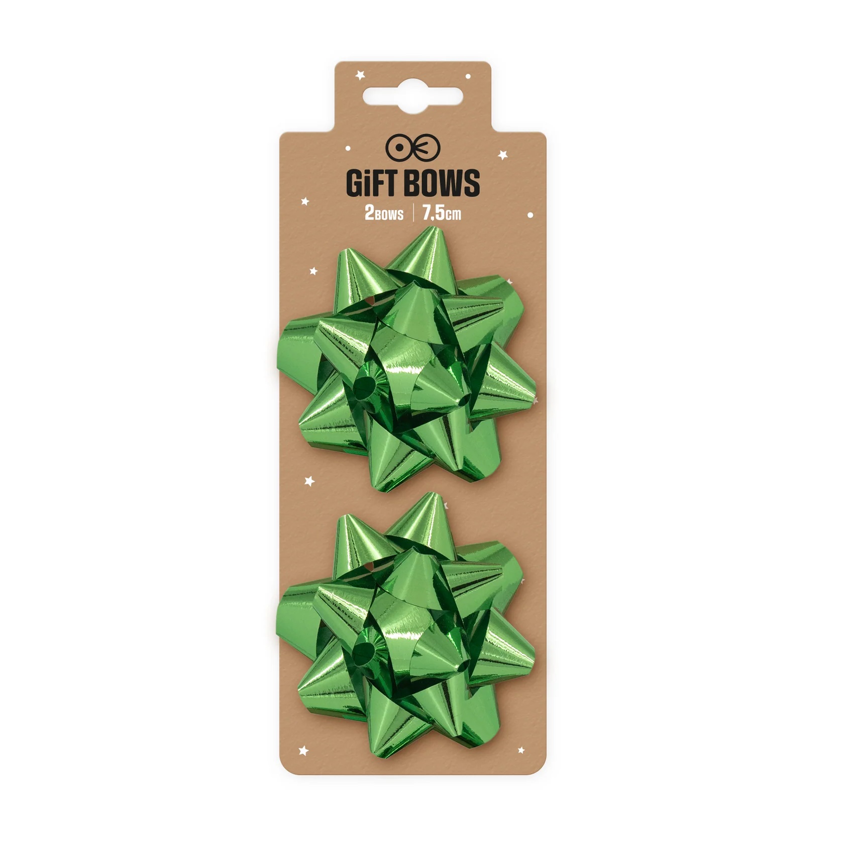 Komplet dwóch zielonych rozetek dekoracyjnych, idealnych do estetycznego wykańczania prezentów. Każda rozetka ma średnicę 7,5 centymetra, co sprawia, że jest subtelnym, ale widocznym akcentem na opakowaniu. Wykonane są z materiału w intensywnym odcieniu zieleni, nawiązującym do świątecznej kolorystyki. Rozetki posiadają samoprzylepną bazę, która umożliwia ich szybkie i trwałe przymocowanie do pudełka lub papieru.