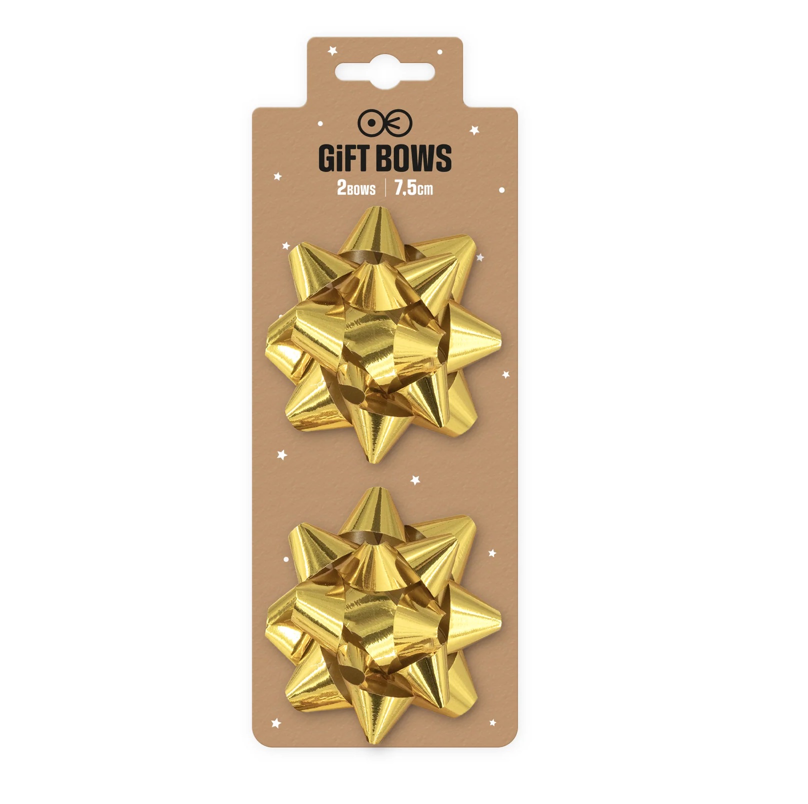 Komplet dwóch złotych rozetek dekoracyjnych przeznaczonych do eleganckiego wykańczania opakowań prezentowych. Każda rozetka ma średnicę 7,5 centymetra i wyróżnia się lśniącym, metalicznym kolorem. Ich złożona, fakturowana powierzchnia tworzy efektowny, trójwymiarowy detal na paczce. Rozetki są wyposażone w element mocujący, co umożliwia ich szybkie i trwałe przymocowanie do papieru.