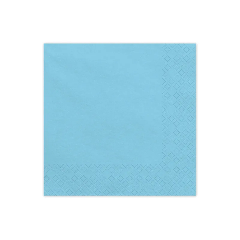 Serwetki papierowe w kolorze jasnoniebieskim. Wymiary po rozłożeniu ok. 33 x 33 cm, wymiary po złożeniu ok. 16,5 x 16,5 cm.