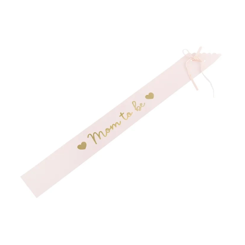 Delikatna papierowa szarfa w odcieniu bladoróżowym ozdobiona eleganckim, złotym napisem „Mom to be”. Stanowi uroczy dodatek dla przyszłej mamy podczas baby shower lub sesji zdjęciowej. Ma około 9,5 cm szerokości i 75 cm długości, dzięki czemu ładnie się układa i efektownie prezentuje na sylwetce.