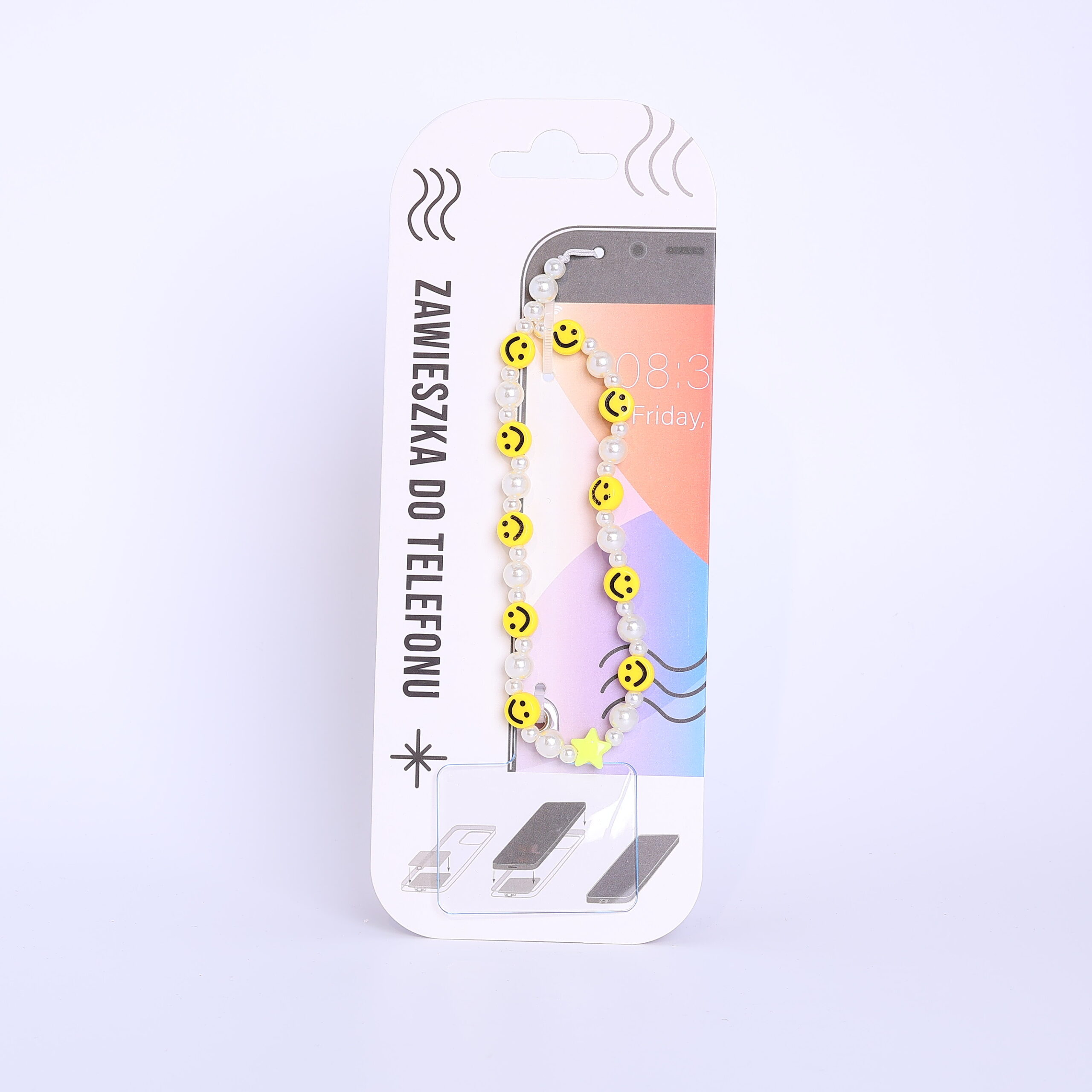 Kolorowa zawieszka do telefonu to radosny gadżet, który doda Twojemu urządzeniu pozytywnej energii. Akcesorium składa się z lśniących, białych koralików przypominających perły, które zostały zestawione z jaskrawożółtymi elementami w kształcie uśmiechniętych buziek oraz małą gwiazdką. Zawieszka jest nie tylko efektowną ozdobą, ale również praktycznym uchwytem, który ułatwia bezpieczne trzymanie telefonu i zapobiega jego przypadkowemu upuszczeniu. Dzięki uniwersalnemu mocowaniu produkt pasuje do większości modeli etui, stanowiąc doskonały sposób na wyróżnienie swojego smartfona i podkreślenie radosnego stylu.
