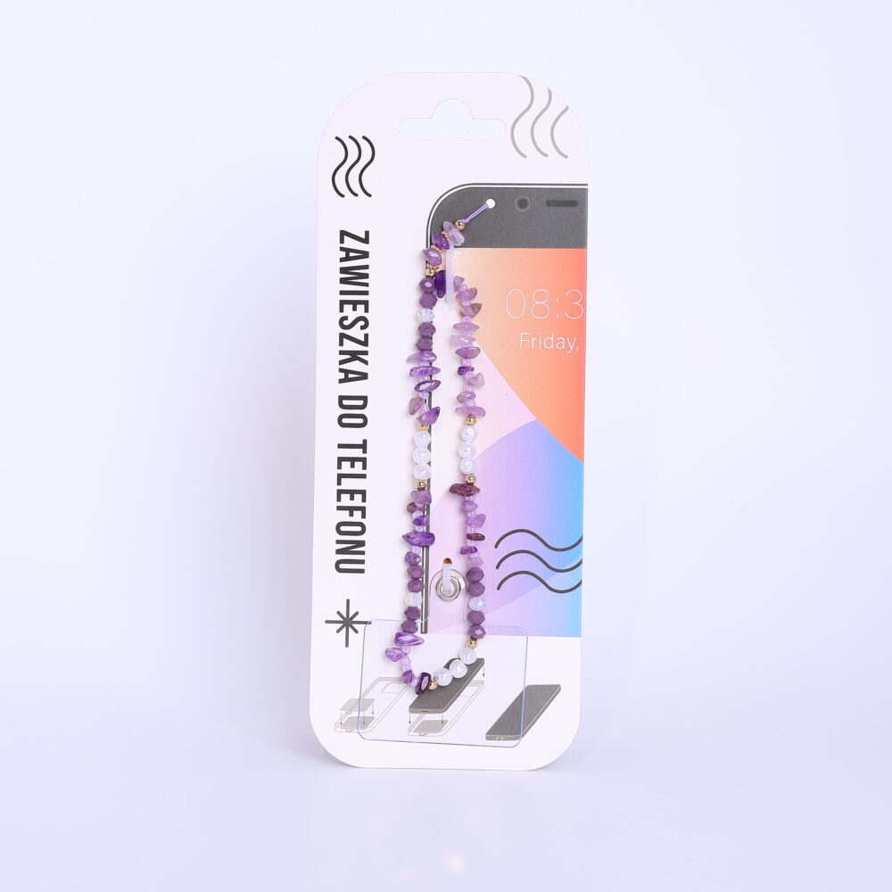 Oryginalna zawieszka do telefonu w odcieniach fioletu to stylowy dodatek, który nada Twojemu urządzeniu unikalny charakter. Akcesorium zostało wykonane z drobnych, fioletowych kamieni o nieregularnych kształtach, które przeplatają się z subtelnymi białymi koralikami oraz złotymi akcentami. Taka kompozycja tworzy efektowny, biżuteryjny design, idealnie wpisujący się w aktualne trendy. Zawieszka pełni nie tylko funkcję ozdobną, ale jest także praktycznym paskiem na nadgarstek, który ułatwia bezpieczne trzymanie telefonu i chroni go przed przypadkowym upadkiem. Dzięki uniwersalnemu mocowaniu produkt pasuje do większości etui, stanowiąc doskonały wybór dla osób ceniąnych wyraziste i funkcjonalne dodatki.