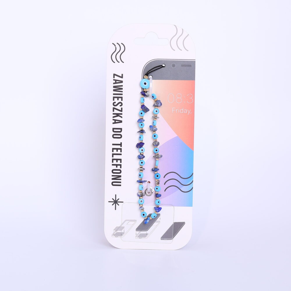 Stylowa zawieszka do telefonu to wyjątkowy dodatek, który łączy w sobie elegancję i modny design. Akcesorium zostało skomponowane z drobnych, złotych koralików oraz licznych elementów z motywem „oka proroka”, które przeplatają się z nieregularnymi, ciemnoniebieskimi kamieniami. Taka kompozycja nadaje urządzeniu unikalny, biżuteryjny wygląd i wyróżnia je z tłumu. Zawieszka pełni również funkcję praktyczną, służąc jako wygodny pasek na dłoń, który chroni smartfona przed przypadkowym upadkiem. Dzięki uniwersalnemu mocowaniu produkt pasuje do większości etui, stanowiąc idealne dopełnienie codziennych stylizacji dla osób ceniących oryginalne i symboliczne detale.