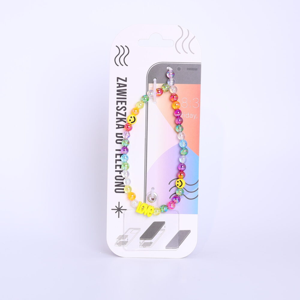Radosna zawieszka do telefonu z napisem „LOVE” to kolorowy dodatek, który wprowadzi pozytywną energię do Twojego codziennego looku. Akcesorium zostało wykonane z błyszczących, transparentnych koralików w intensywnych barwach tęczy, które pięknie mienią się w świetle. Kompozycję urozmaicają żółte akcenty w postaci koralików z uśmiechniętymi buźkami oraz wyrazisty, żółty napis „LOVE” umieszczony w dolnej części. Zawieszka pełni funkcję biżuteryjnej ozdoby oraz praktycznej smyczy na nadgarstek, która ułatwia trzymanie smartfona i zapobiega jego przypadkowemu upuszczeniu. Dzięki uniwersalnemu sznurkowi montaż do etui jest niezwykle prosty, a radosny design sprawia, że jest to idealny gadżet dla osób lubiących wyróżniać się optymistycznymi dodatkami.