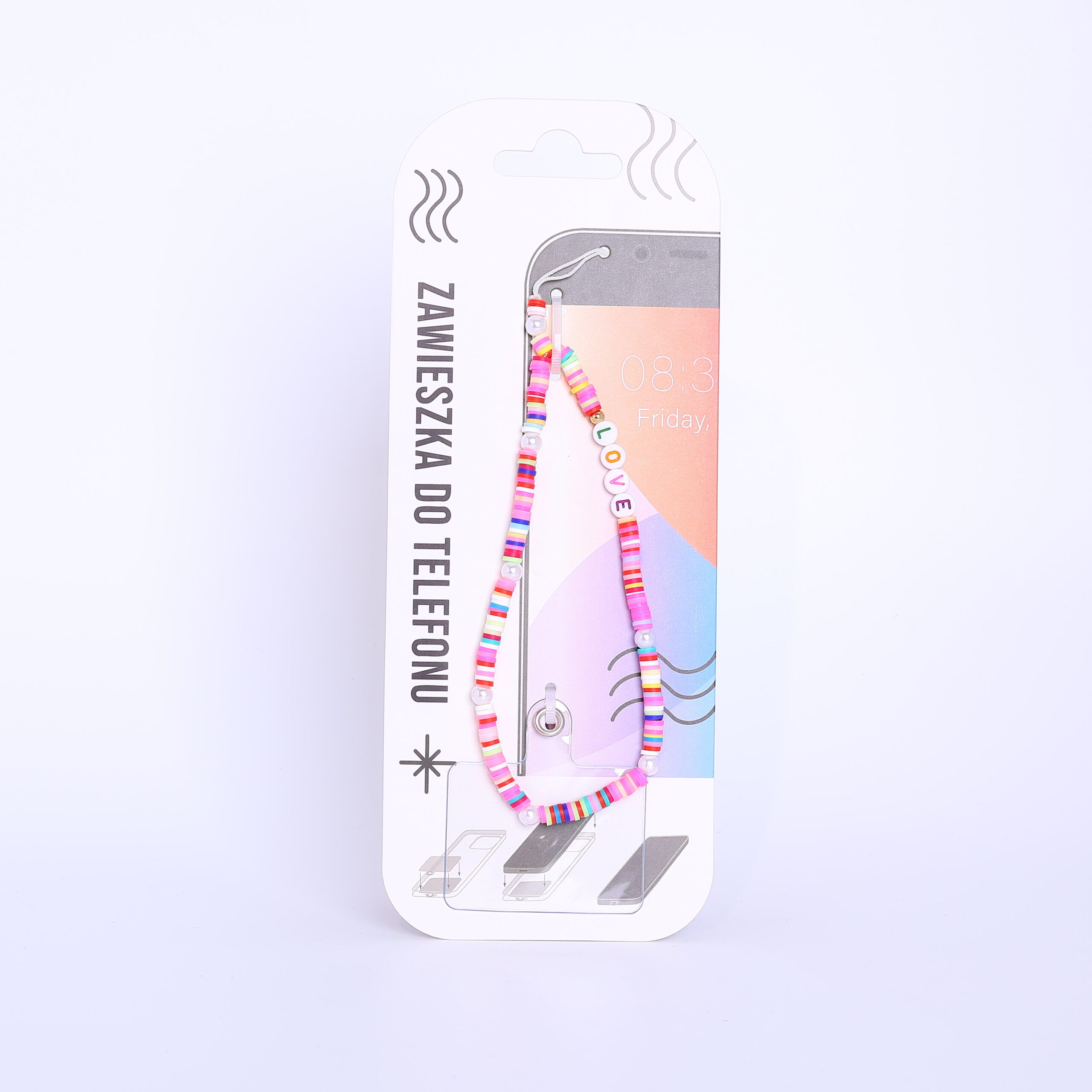 Kolorowa zawieszka do telefonu z napisem LOVE to radosny dodatek, który nada Twojemu urządzeniu pozytywnej energii. Akcesorium zostało wykonane z płaskich, wielobarwnych koralików w odcieniach różu, fioletu i czerwieni, które przeplatają się z białymi perłami o gładkiej powierzchni. Głównym elementem ozdobnym są okrągłe koraliki z literami tworzącymi napis LOVE, co nadaje całości modny i personalny charakter. Zawieszka pełni funkcję biżuteryjnej ozdoby oraz praktycznej smyczy na nadgarstek, która ułatwia trzymanie smartfona i zapobiega jego przypadkowemu upuszczeniu. Dzięki uniwersalnemu sznurkowi montaż do etui jest szybki i prosty, stanowiąc idealny sposób na odświeżenie wyglądu telefonu.