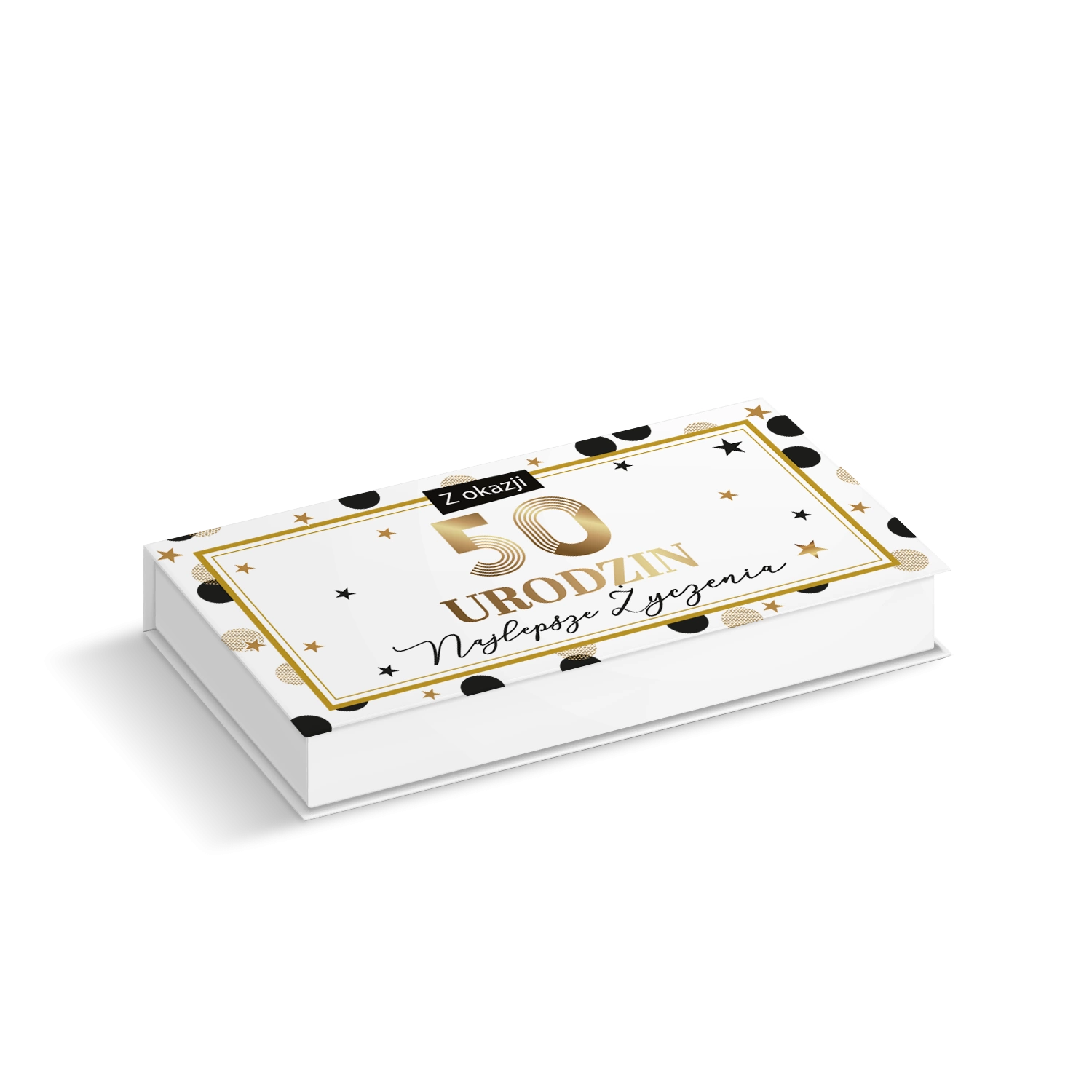 Eleganckie pudełko prezentowe o wymiarach 18×9 cm to stylowy sposób na wręczenie pieniędzy lub karty podarunkowej z okazji 50. urodzin. Białe opakowanie zostało ozdobione nowoczesnym motywem dużych, czarnych i złotych grochów oraz subtelnymi gwiazdkami, co nadaje mu radosny, a jednocześnie luksusowy charakter. W centralnej części znajduje się efektowna, złota cyfra „50” oraz napisy „Z okazji URODZIN Najlepsze Życzenia”, ujęte w klasyczną złotą ramkę. Dzięki swojej formie i estetyce, pudełko stanowi wyjątkową oprawę dla upominku, zmieniając go w osobistą pamiątkę tego ważnego święta.