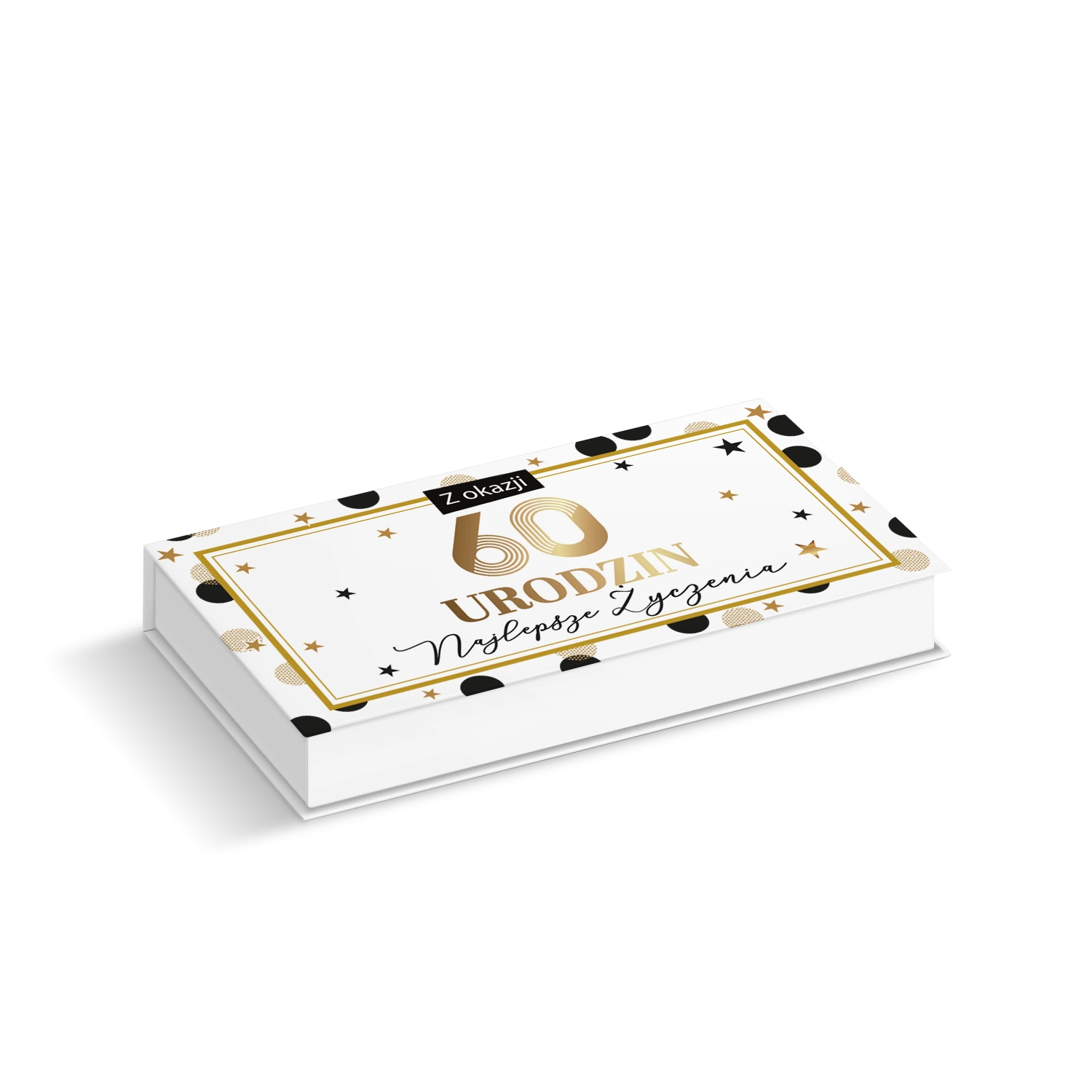 Eleganckie pudełko prezentowe o wymiarach 18×9 cm to stylowy sposób na wręczenie pieniędzy lub karty podarunkowej z okazji 60. urodzin. Białe opakowanie zostało ozdobione nowoczesnym motywem dużych, czarnych i złotych grochów oraz subtelnymi gwiazdkami, co nadaje mu radosny, a jednocześnie luksusowy charakter. W centralnej części znajduje się efektowna, złota cyfra „60” oraz napisy „Z okazji URODZIN Najlepsze Życzenia”, ujęte w klasyczną złotą ramkę. Dzięki swojej formie i estetyce, pudełko stanowi wyjątkową oprawę dla upominku, zmieniając go w osobistą pamiątkę tego ważnego święta.