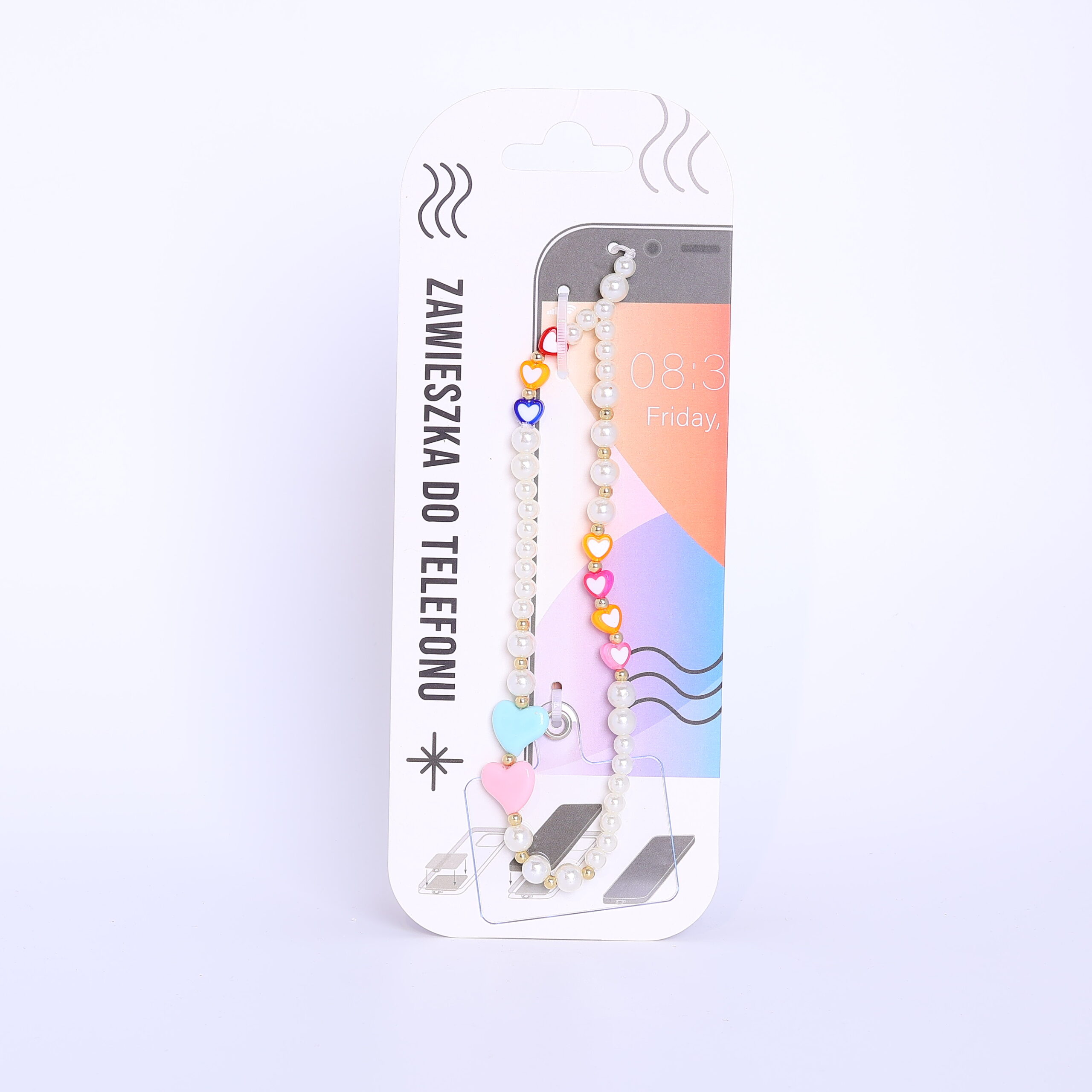 Elegancka zawieszka do telefonu łącząca klasyczny blask pereł z radosnymi, kolorowymi akcentami. Główną część akcesorium stanowią lśniące, białe koraliki o perłowym wykończeniu, które przeplatają się z drobnymi złotymi detalami. Wyjątkowego charakteru nadają jej liczne elementy w kształcie serduszek w soczystych kolorach – od żółtego i pomarańczowego, przez różowy i fioletowy, aż po błękit. Całość wieńczą dwa większe, pastelowe serca w dolnej części zawieszki. Produkt pełni funkcję biżuteryjnej ozdoby oraz praktycznej smyczy na nadgarstek, która ułatwia bezpieczne trzymanie smartfona i chroni go przed przypadkowym upadkiem. Dzięki uniwersalnemu sznurkowi montaż do etui jest szybki i bezproblemowy, co pozwala natychmiast odmienić wygląd Twojego urządzenia.
